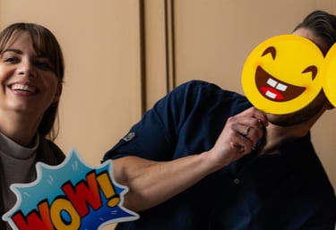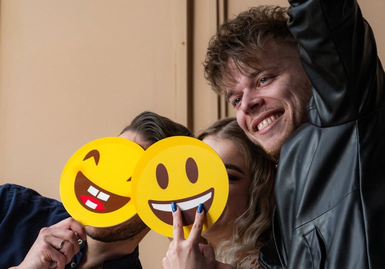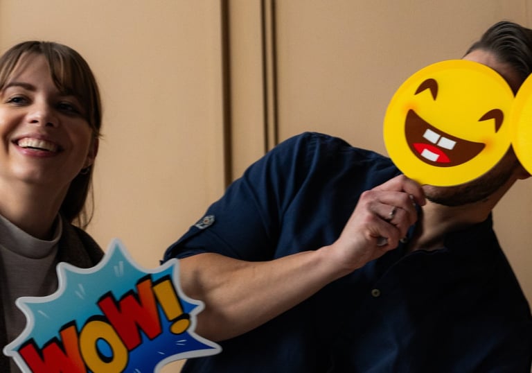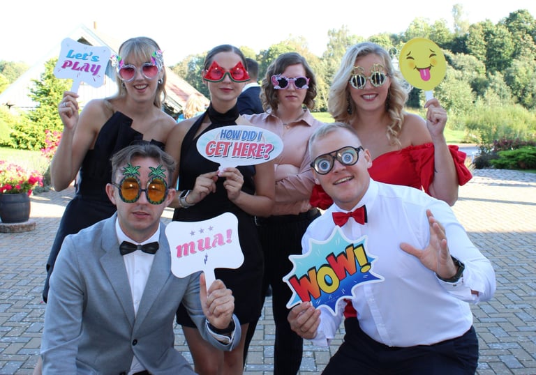 Kad nuotraukos būtų žaismingesnės siūlome gausybę nemokamos atributikos, pvz: akiniai, įvairios lentelės su užrašais/šypsenomis, lūpos, karūnos ir pan.